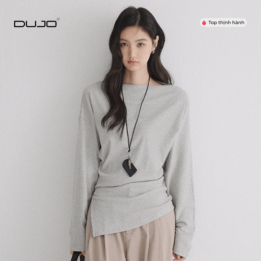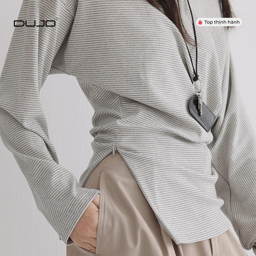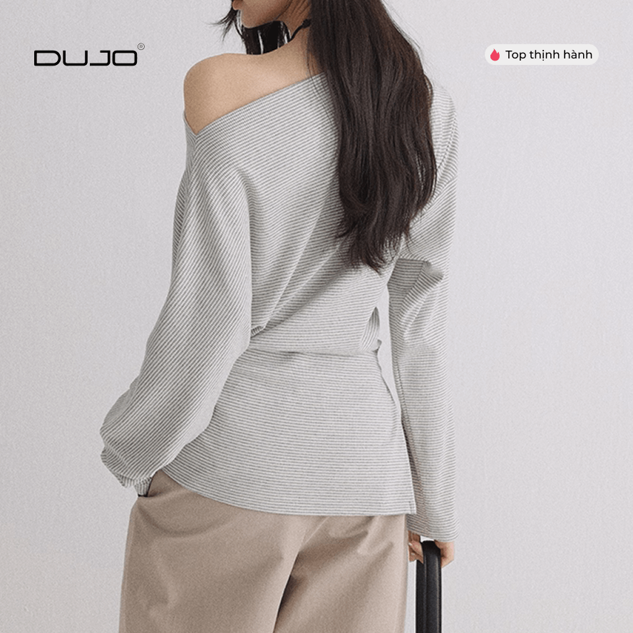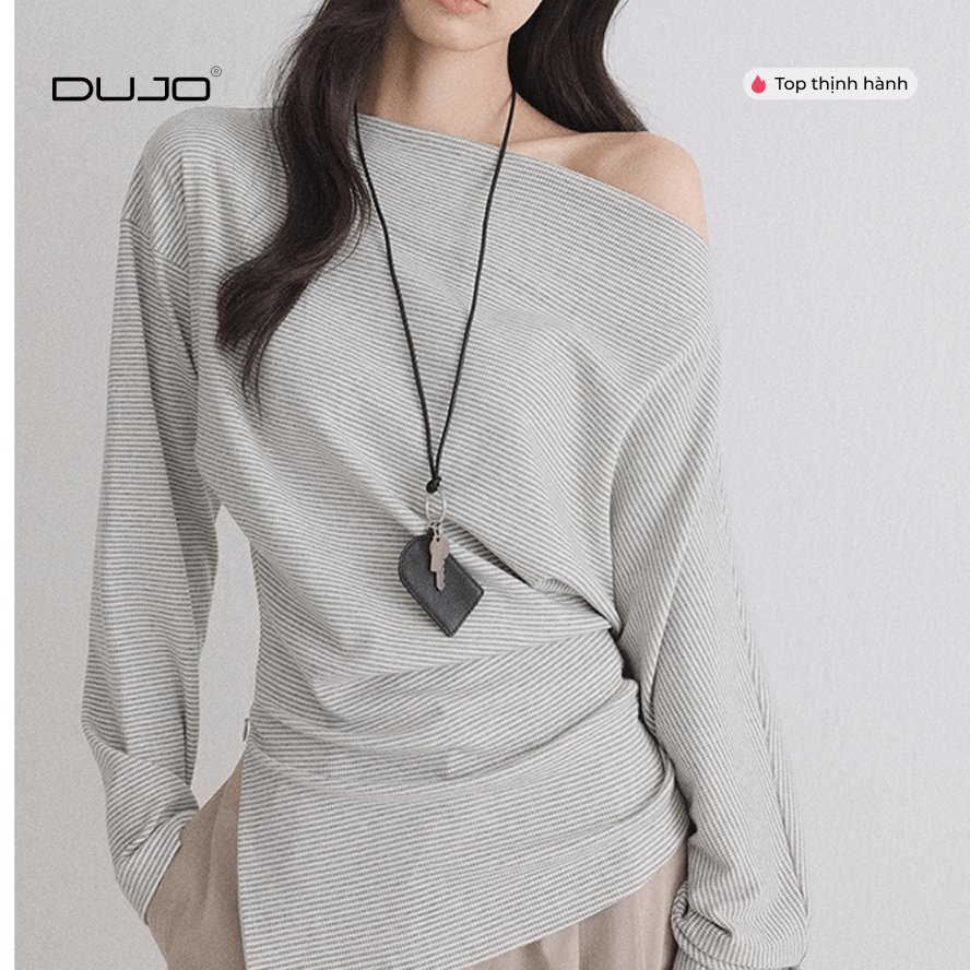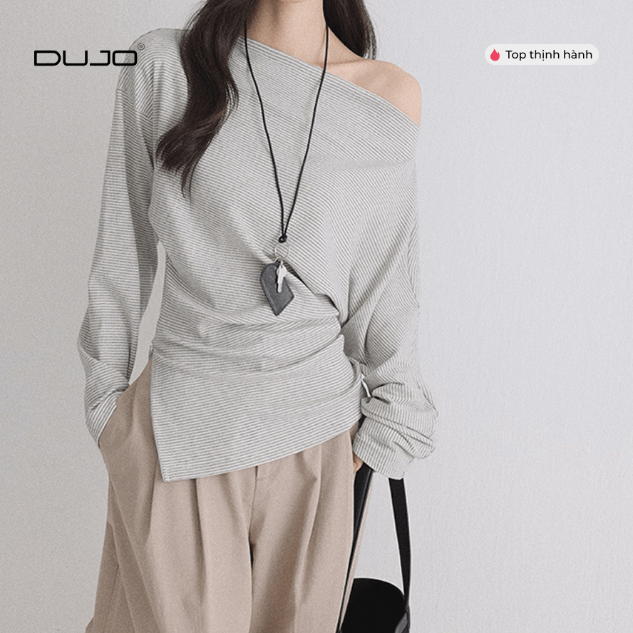 Áo Thun Lệch Vai “Design Minimal” – Kẻ Sọc Xám Trắng Thanh Lịch