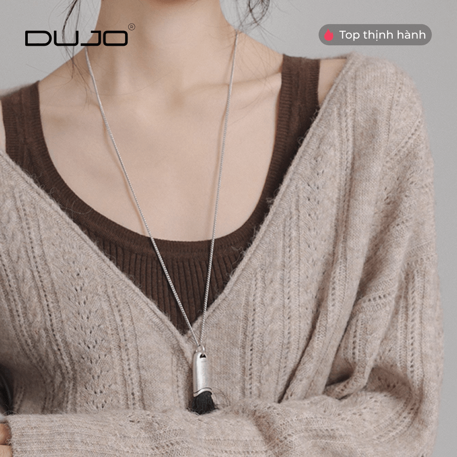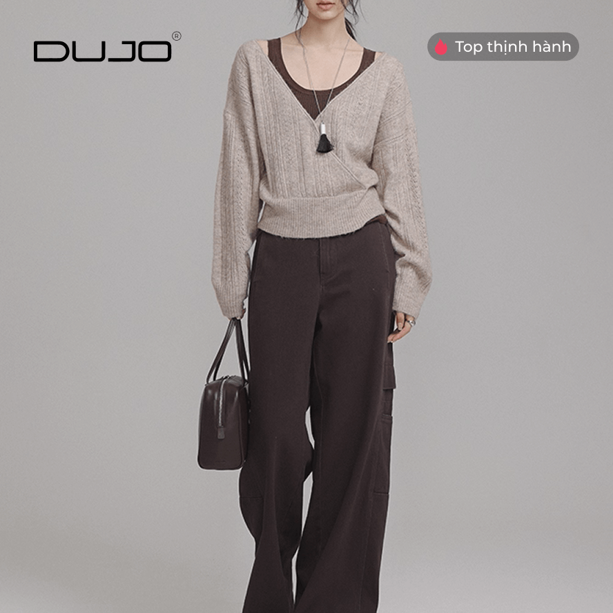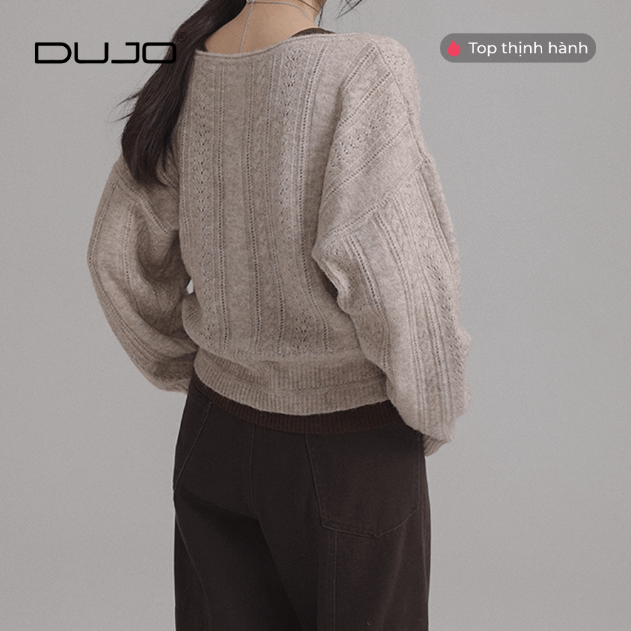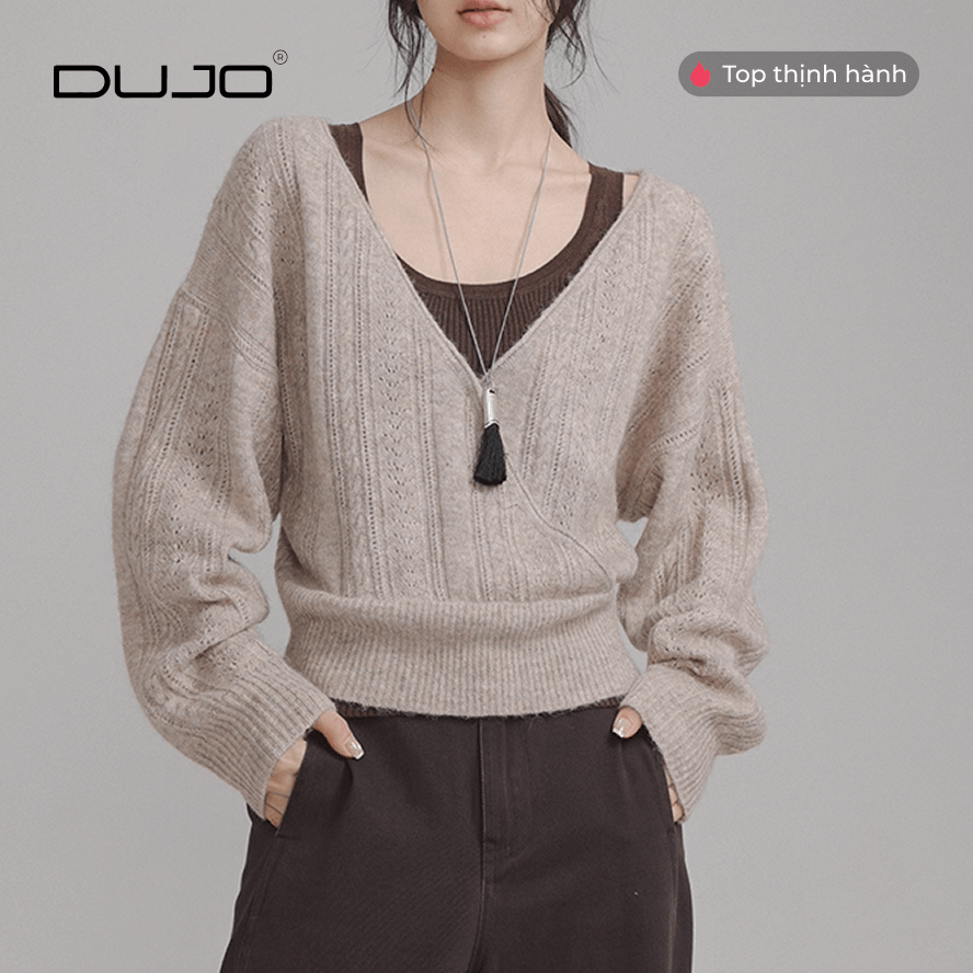 [DUJO TIỂU THƯ] Áo Len V-Cổ “Crochet Retro” – Tông Cà Phê Sang Trọng