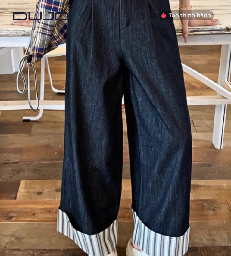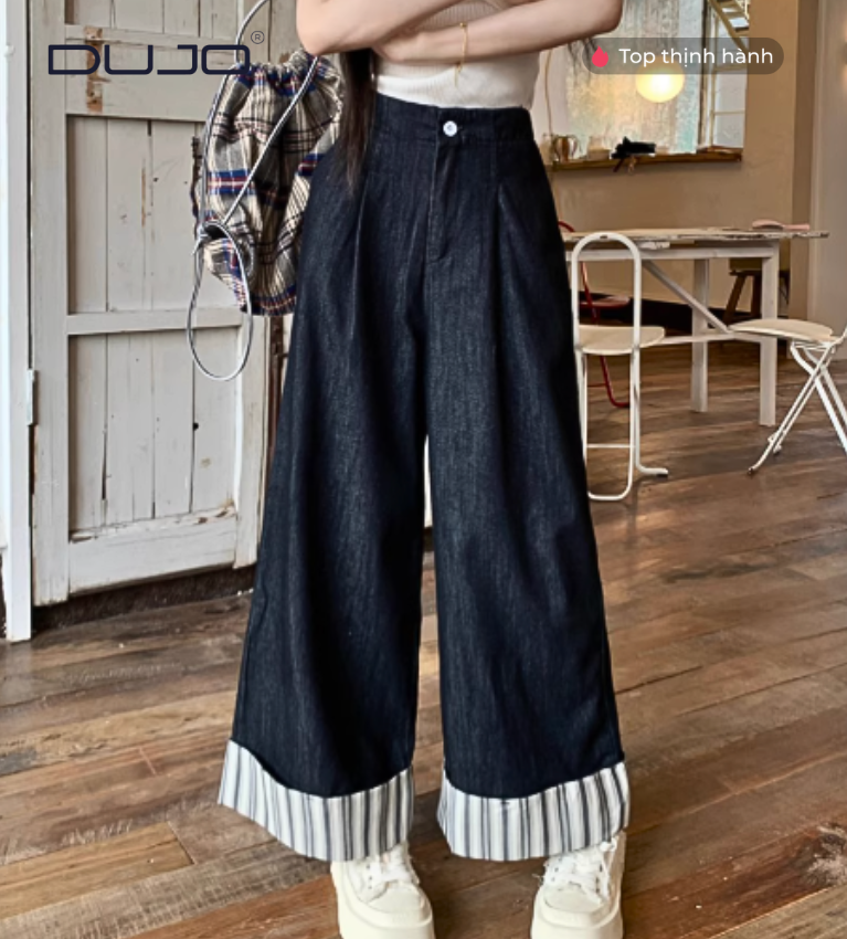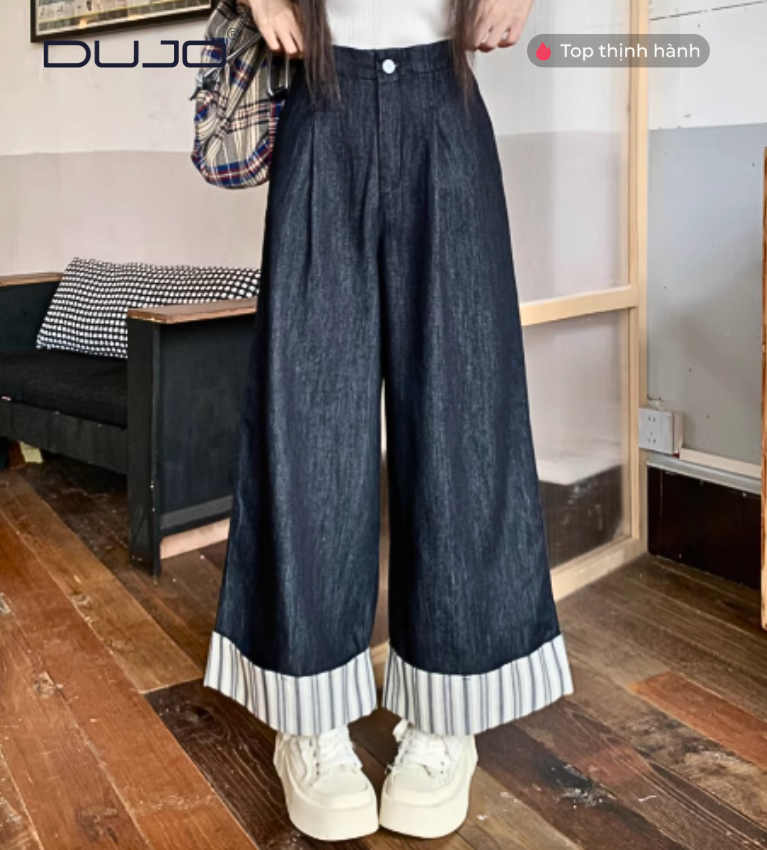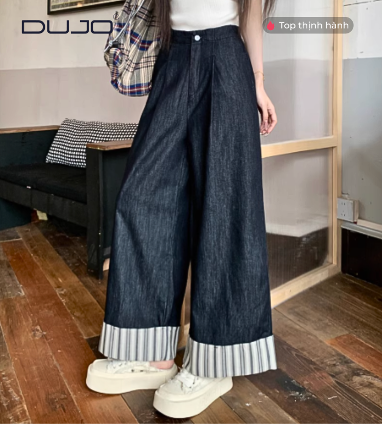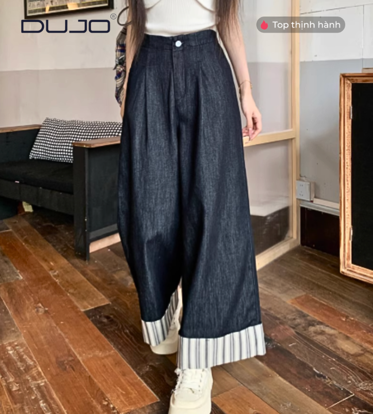 Quần Jeans Ống Rộng 9 Phân – Sọc Cá Tính, Eo Chun Thoải Mái