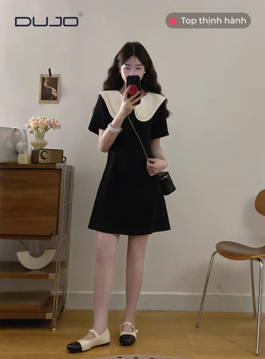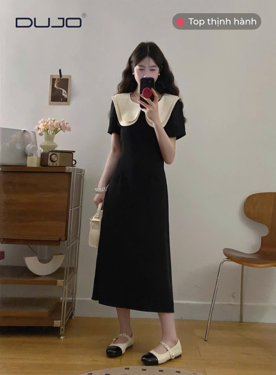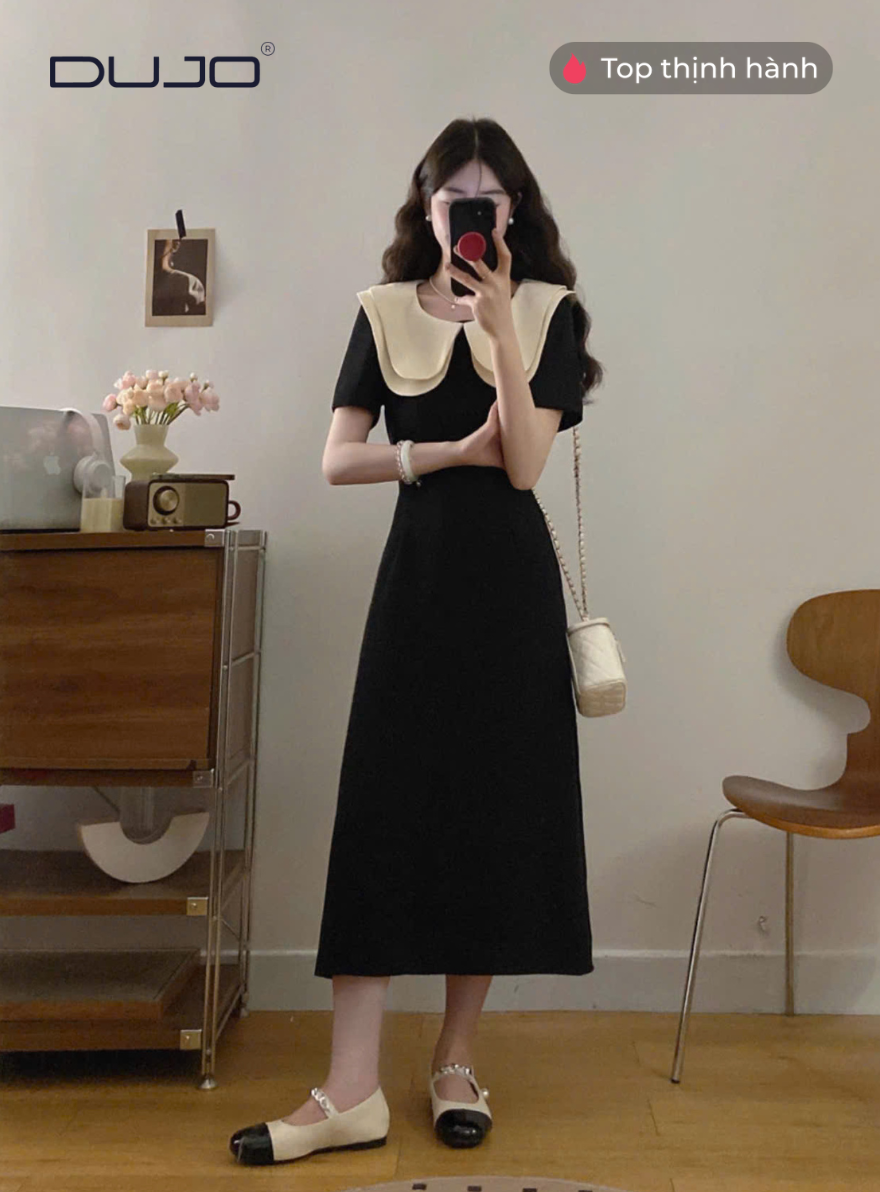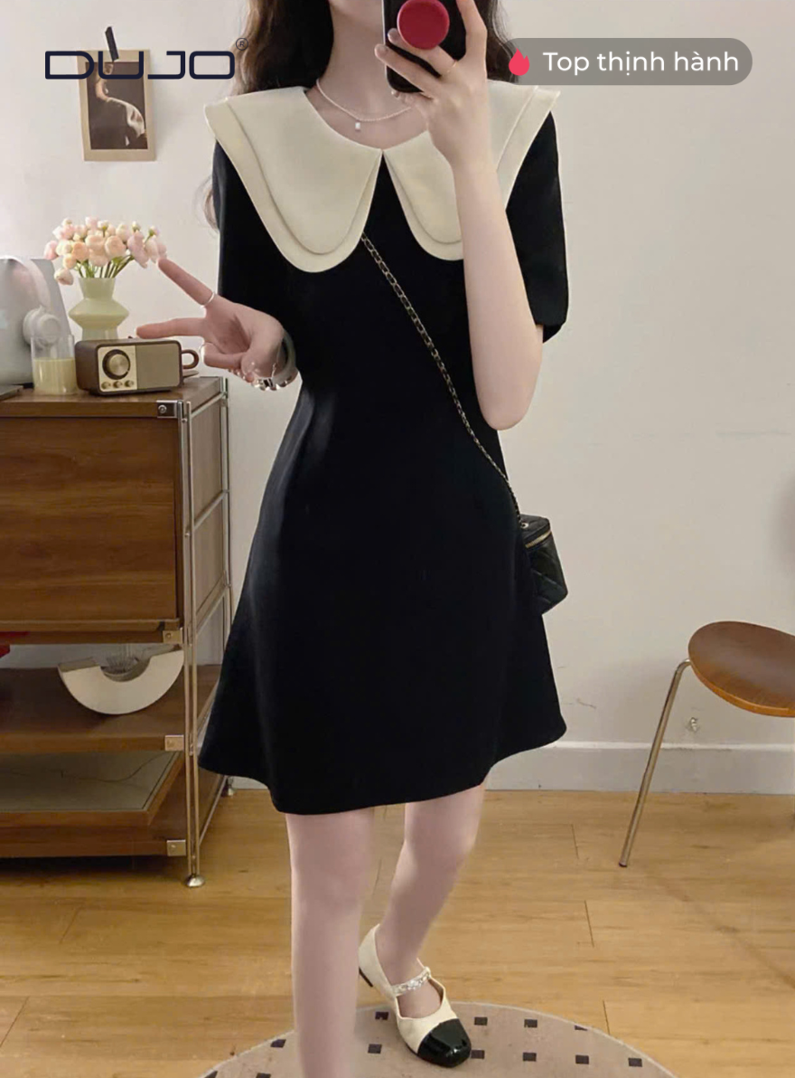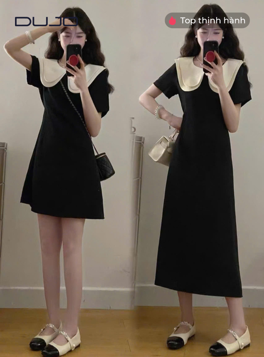 Váy Đen Phối Màu Cổ Búp Bê, Phong Cách Pháp Thanh Lịch, Che Khuyết Điểm Big Size